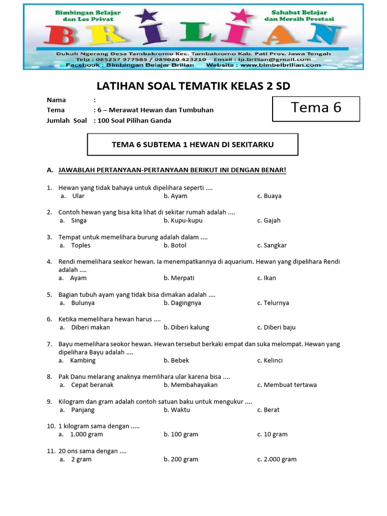 Contoh soal tematik tema 6 kelas 2 SD di atas mencakup berbagai aspek penting dalam merawat hewan dan tumbuhan. Dengan mempelajari dan mengerjakan soal-soal ini, diharapkan siswa dapat meningkatkan pemahaman mereka tentang tema ini dan mengembangkan sikap positif terhadap lingkungan sekitar. Guru dan orang tua dapat menggunakan contoh soal ini sebagai referensi untuk membantu siswa belajar dan berlatih di rumah. Penting untuk diingat bahwa pembelajaran tematik menekankan pada integrasi berbagai mata pelajaran, sehingga siswa dapat melihat keterkaitan antara berbagai konsep dan mengaplikasikannya dalam kehidupan sehari-hari.